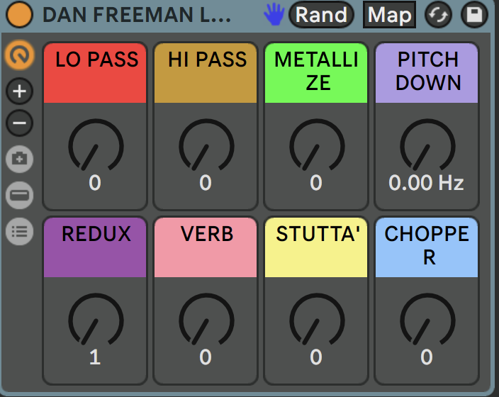 This is an audio effect rack that I created with 8 effects that are very useful for DJing and performing live. It has low pass/high pass filters that are found on a DJ mixer, but also a bunch of other effects including 'Stutta' which grabs audio and repeats it. For a video on how it works go here or watch below. Enjoy!